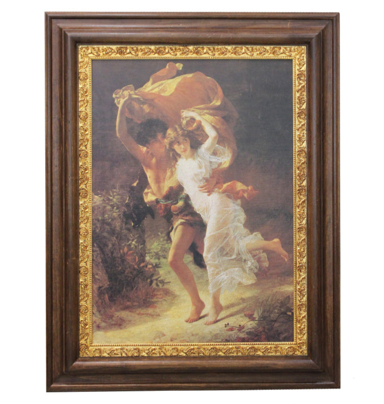 An image reproduction of the renowned artwork 'The Storm' by Pierre Auguste Cot, a French painter from 1880, captures the essence of lovers seeking refuge from the stormy rain, clutching shawls to shield themselves from the raindrops.
