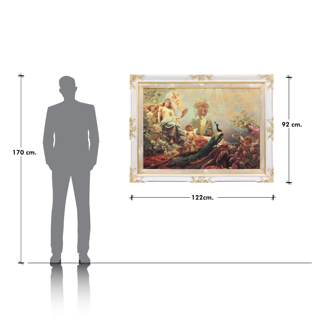 Experience ethereal beauty with Angel and Peacock. This classic European painting depicts a heavenly scape, with a holy lady amidst stunning peacocks and soft clouds. The perfect addition to any art collection, indulge in sophistication like no other.